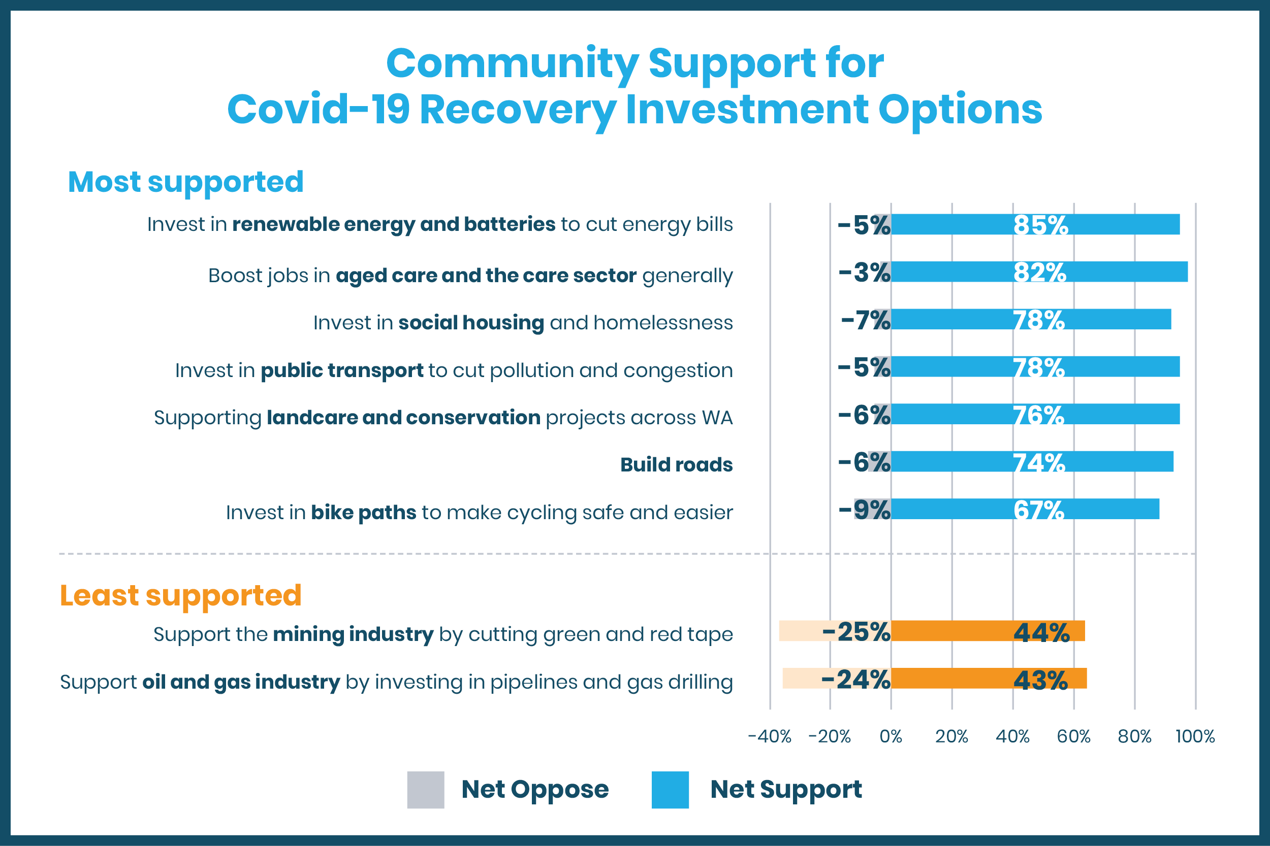 - Investment in renewable energy and batteries, aged care, social housing, public transport, Landcare and conservation all receive a very high level of public support for stimulus investment.